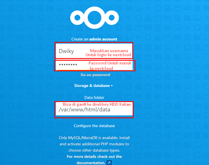 - Jika sudah masukkan username dan password yang akan di gunakan untuk masuk ke nextcloudnya nanti, Pada data folder kalian bisa ganti ke hdd external, tapi jangan lupa untuk mount dulu dan permissionnya di ganti juga.