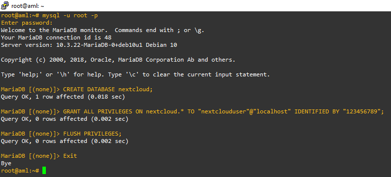 GRANT ALL PRIVILEGES ON nextcloud.* TO "nextclouduser"@"localhost" IDENTIFIED BY "123456789";- warna hijau = nama database, bisa di ganti terserah kalian.
